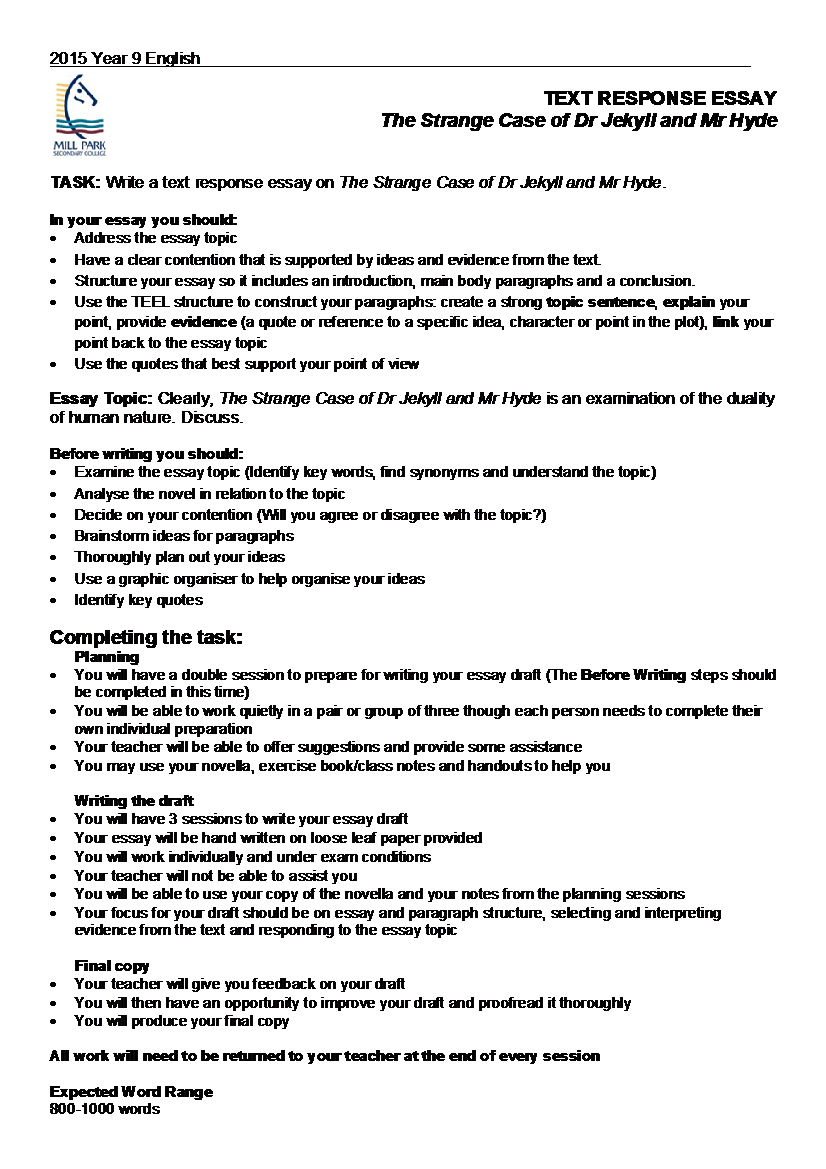 Essay topic: Clearly, The Strange Case of Dr Jekyll and Mr Hyde is an examination of the duality of human nature. Discuss. See Appendix 1 below for task sheet.