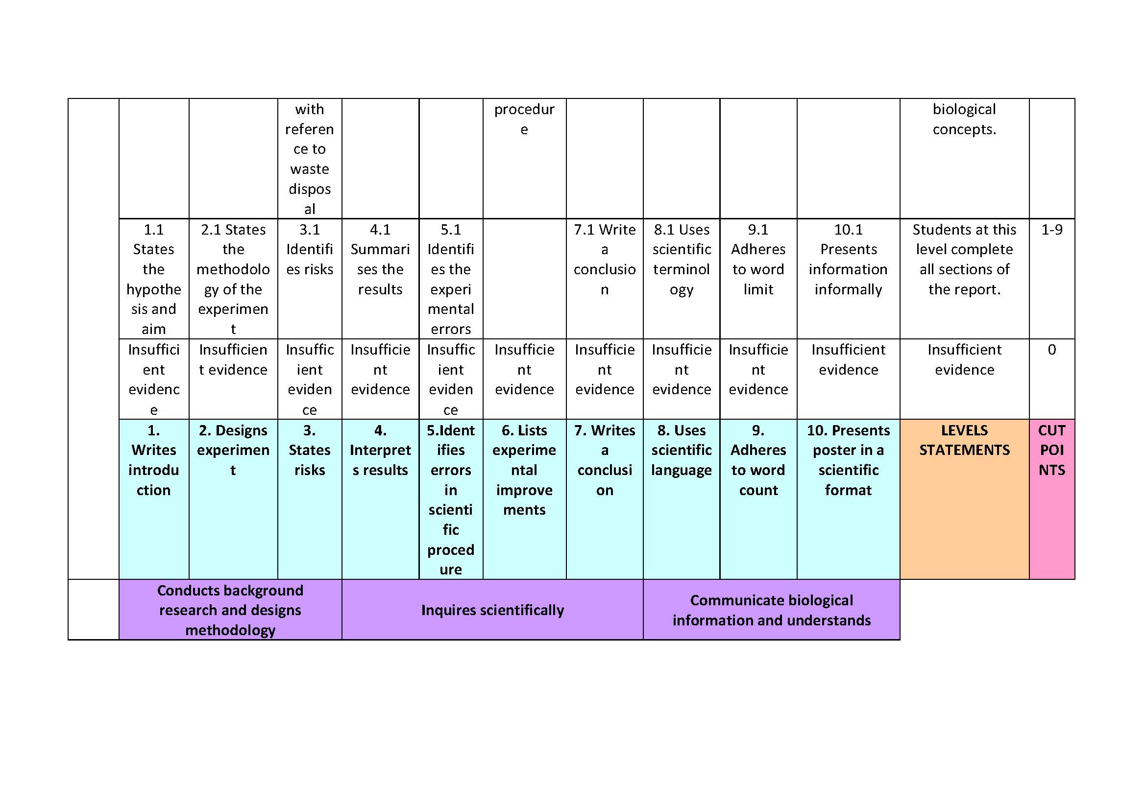 Low – Students at this level plan for and conduct an investigation with a prescribed purpose. Students gather data, include a discussion with mention of biological concepts and communicate their ideas informally. This information is presented in a poster format.