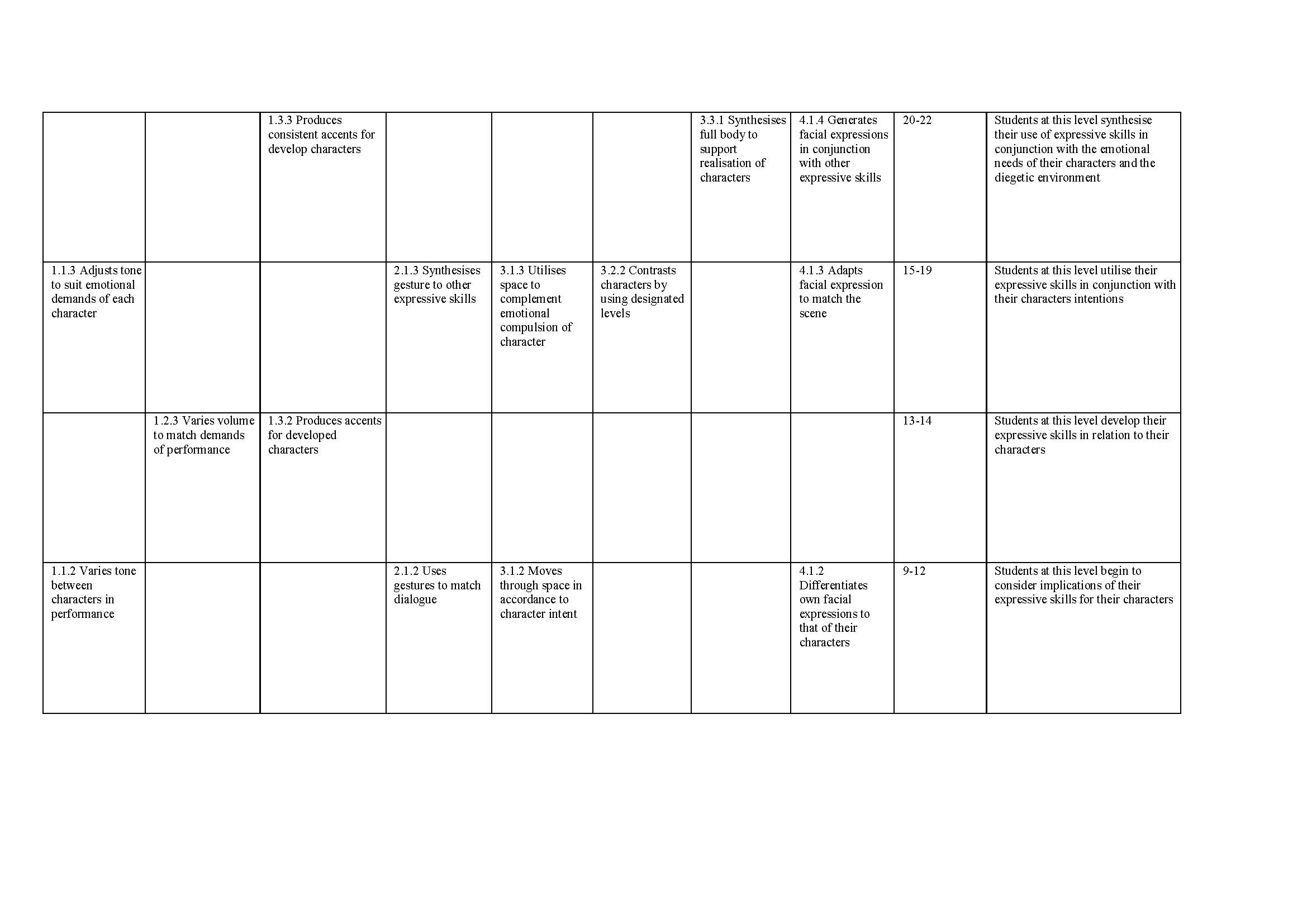| highest | At this level, students synthesise all expressive skill sets (Voice, Gesture, Movement, Facial Expression) to establish and differentiate characters. They also maintain focus within the diegetic environment throughout their performance. |
