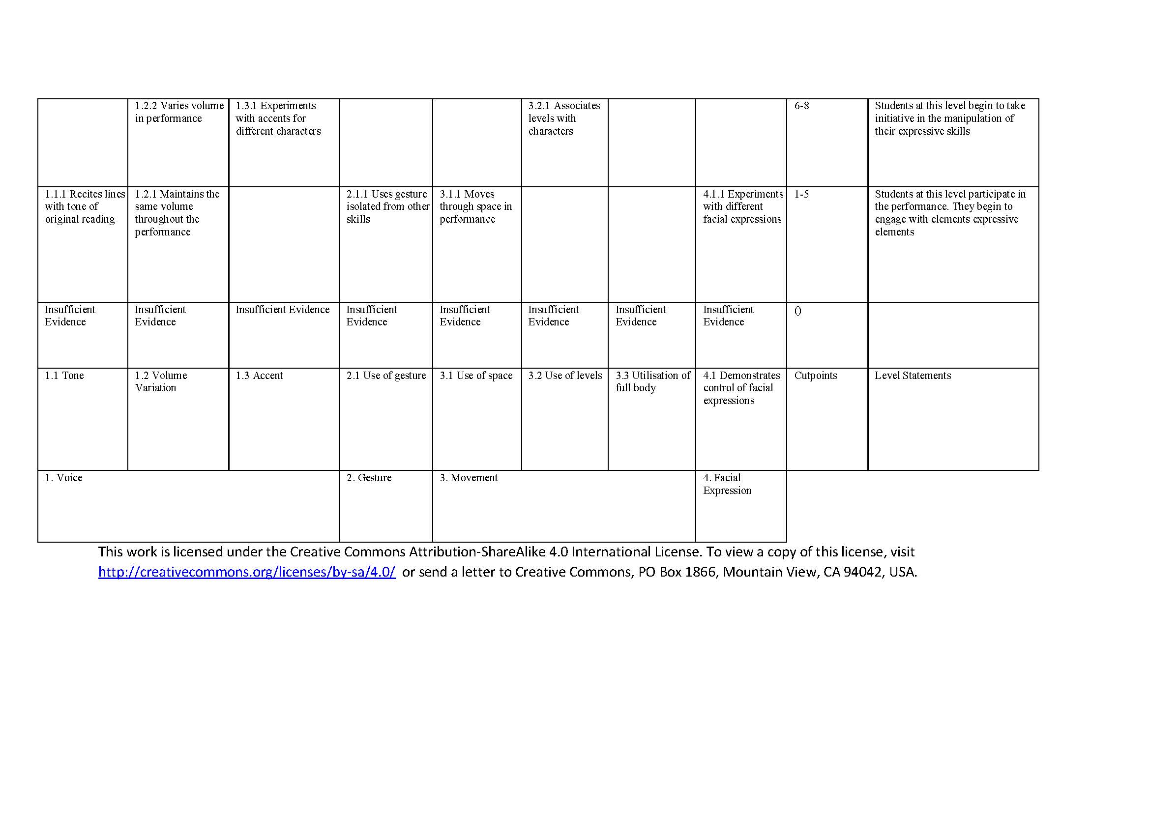 | lowest | At this level, students demonstrate limited application of expressive skills (Voice, Gesture, Movement, Facial Expression). Memorisation of role incomplete. They struggle to differentiate the diegetic and non-diegetic environment. |