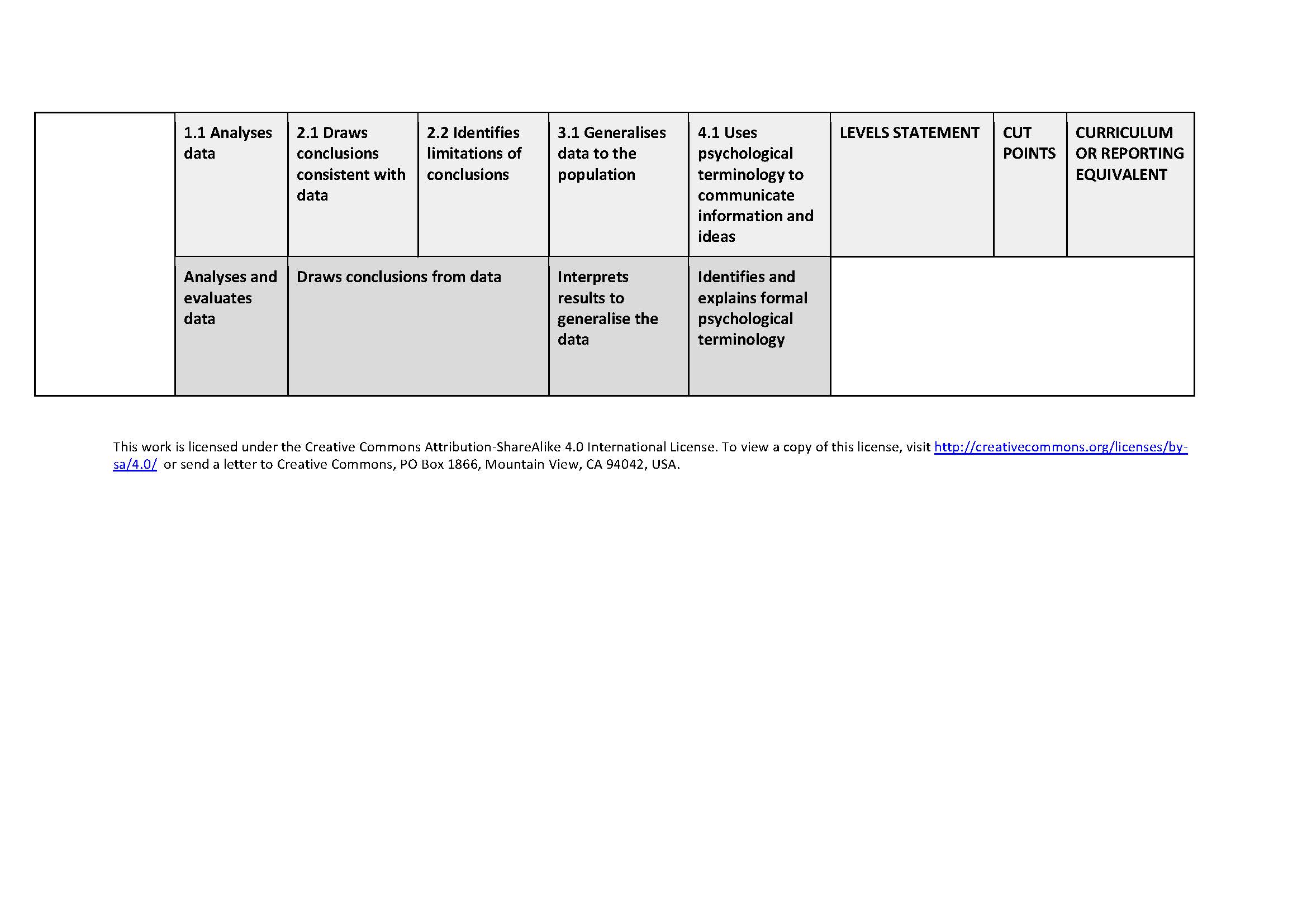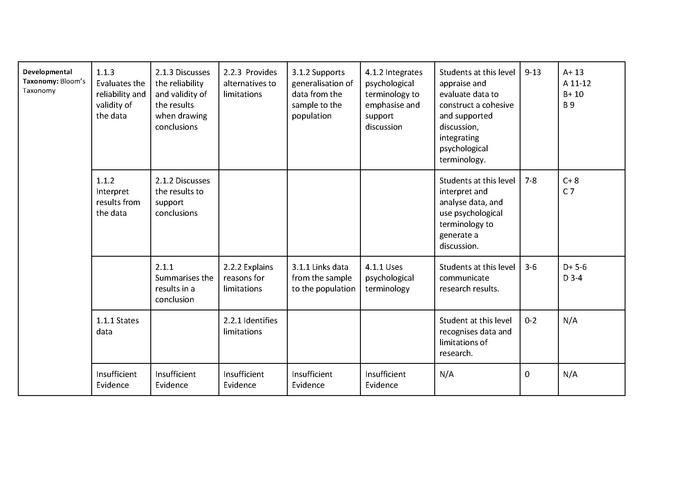 · Integrates psychological terminology to support and emphasise key points within the discussion · Evaluates data to draw conclusions · Evaluates results to identify and explain limitations, and suggest alternative methods to avoid or eliminate such limitations · Generalises data to the population and explains why they have done so |