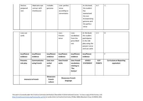 How was the assessment administered (conditions, time, individual/group, access to resources, assistance to students, etc.)? The students presented their dialogue in pairs (in front of their peers) after having rehearsed during several periods. This allowed for authentication of their work. All students presented under the same conditions to control for noise. This improved accuracy and fairness to all the students. |